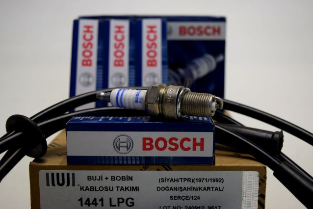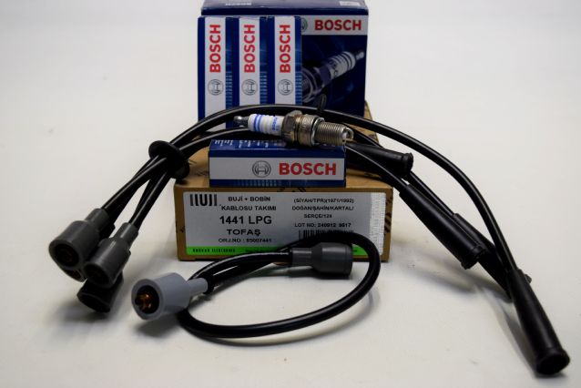 MURAT 131 1300 / 1600 - ŞAHİN KARTAL 1600 - PLATİNLİ ATEŞLEME SİSTEMİNE SAHİP TOFAŞ ARAÇLARIN ATEŞLEME BAKIM SETİDİR - 1- BOSCH MARKA DÖRT ADET BUJİ - 2- UNUVAR MARKA SİYAH BAŞLIKLI LPGLİ ARAÇLAR İÇİN ÜRETİLMİŞ BUJİ KABLO TAKIMI BU SETTE OLAN BUJİ KABLOMUZ BAKIR ORANI DAHA YÜKSEK OLAN KABLODUR - ATEŞLEME BU KABLO İLE DAHA FAZLA İLETKEN OLMAKTADIR ÜRÜN BU İKİ PARÇADAN OLUŞAN ATEŞLEME BAKIM SETİDİR !!!
